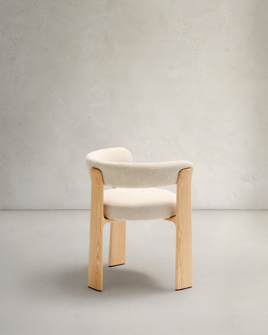 Silla Granite de 3 patas de chenilla beige y madera maciza fresno acabado tono natural FSC 100%