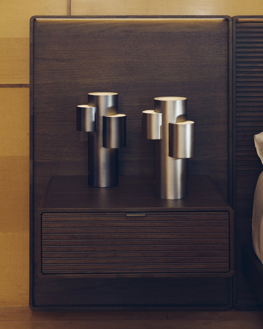 - Lámpara de mesa LED portátil de metal gris con acabado cepillado.