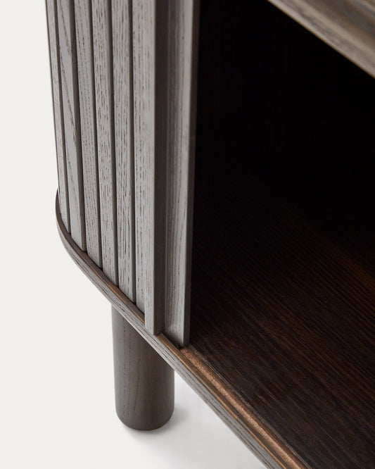 - Mesita de noche hecha de chapa de fresno con acabado oscuro.