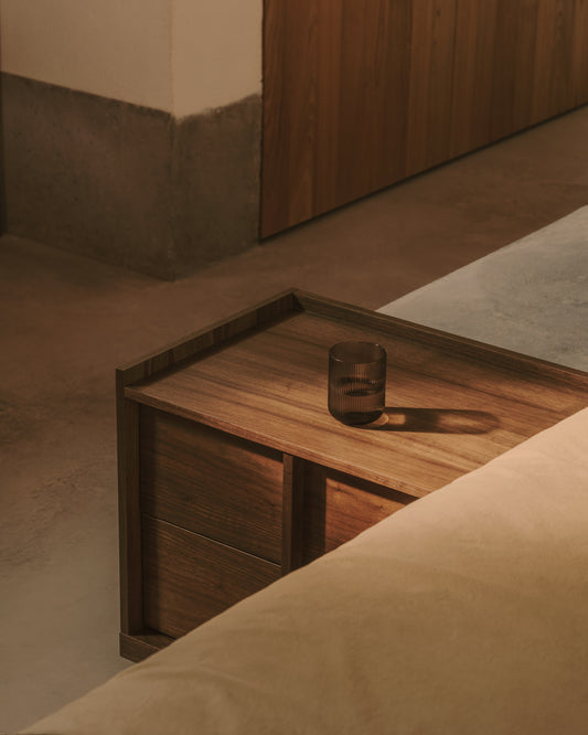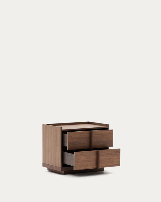 - Mesita de noche hecha de chapa de nogal con acabado oscuro.