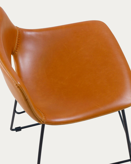 - Tabouret haut de 65 cm avec assise et dossier rembourrés en similicuir marron clair.