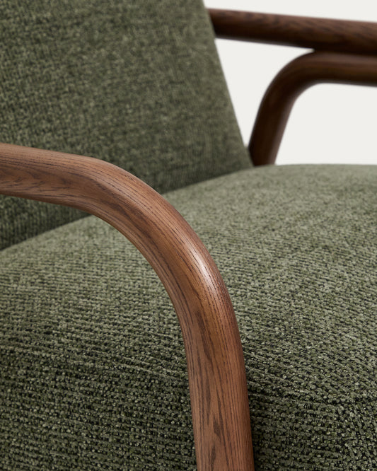Fauteuil Sylo en tissu chenille vert foncé et bois de frêne avec finition ton noyer FSC 100 %
