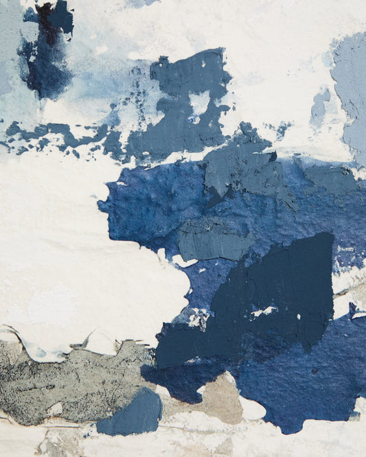 - Tableau abstrait texturé dans les tons de gris et de bleu.