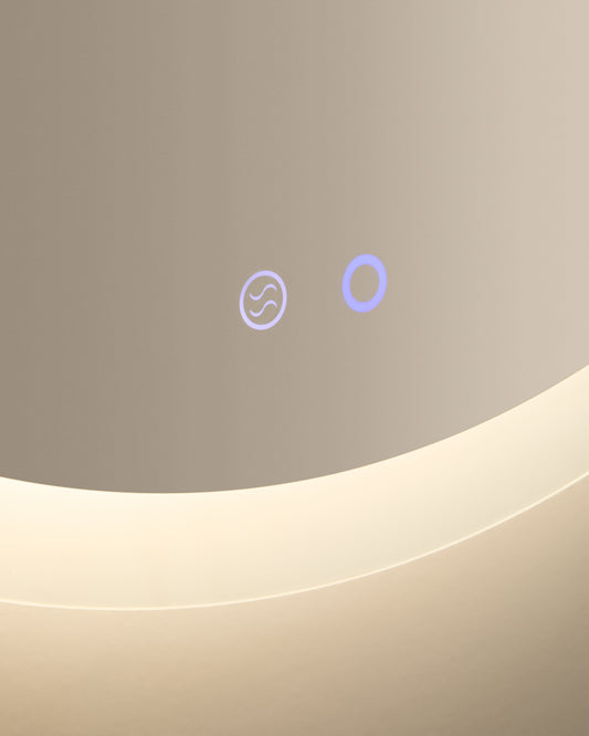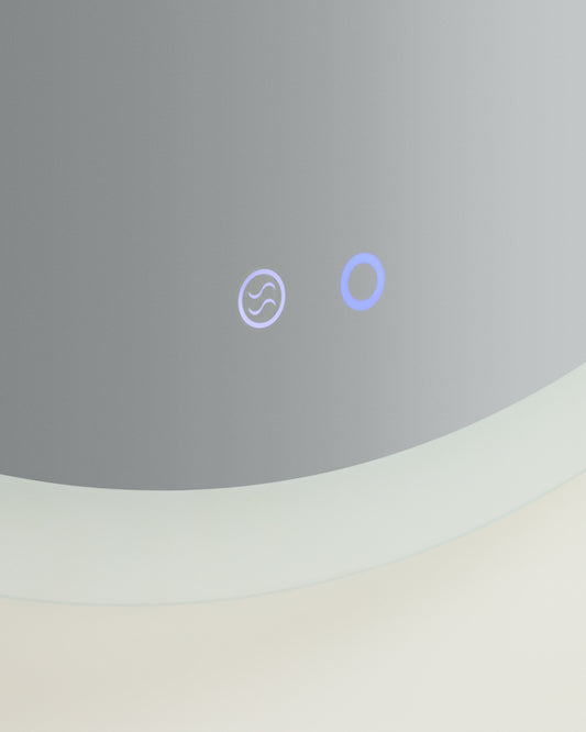 • Miroir de salle de bains rond avec pourtour en verre sablé et fonction antibuée.