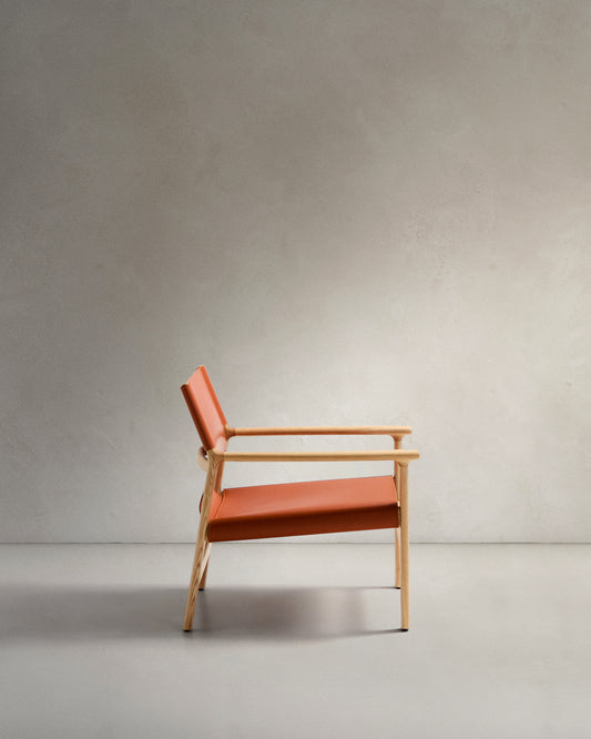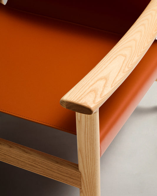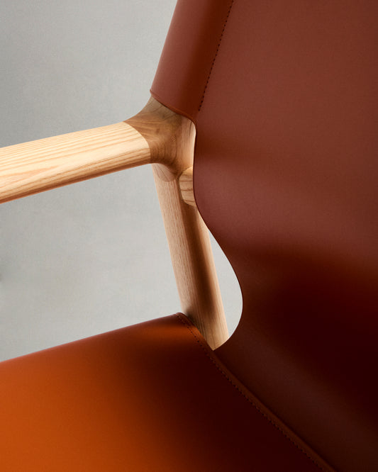 Fauteuil Jan en fibres de cuir recyclé marron clair et bois de frêne avec finition ton naturel FSC 100 %