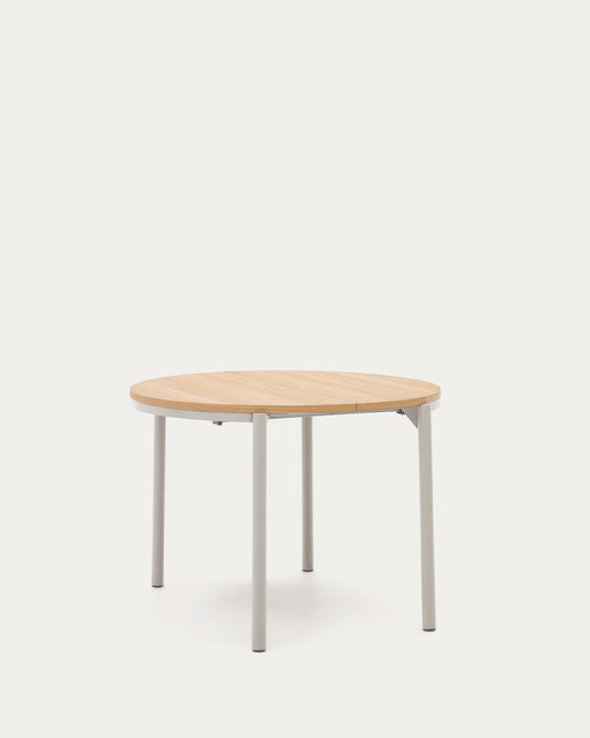 - Table ronde extensible en placage de chêne et pieds en acier gris.
