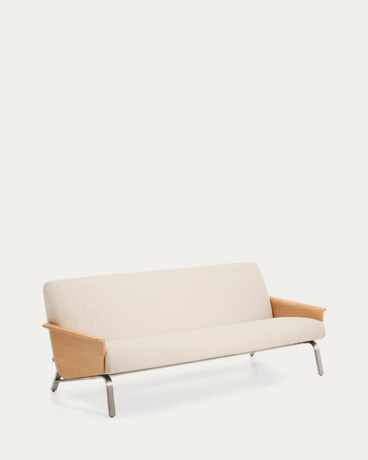 Canapé Amsen en chenille beige de 3 places en contreplaqué de chêne avec pieds en acier inoxydable brossé 205 cm