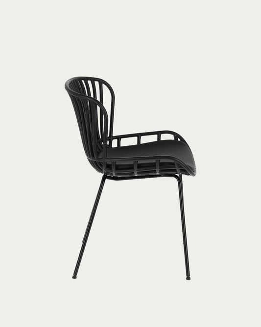 - Chaise de salle à manger faite en plastique teint en noir avec coussin en polyuréthane.
