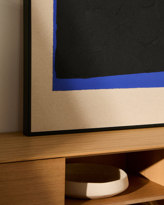 La collection Zernu joue sur le contraste entre le noir et la couleur, créant un effet positif et négatif qui donne une force visuelle à chaque pièce. Ce design évoque la sensation d'objets à contre-jour, mettant en valeur les formes et les volumes avec un effet captivant. La partie noire est travaillée à la peinture, tandis que la base colorée est obtenue à partir d'un tissu peint, générant une superposition qui ajoute de la profondeur et du volume. La toile combine différentes textures, rendant visible la rencontre entre la peinture et le tissu. Chaque trait est perçu de manière unique, soulignant la richesse des matériaux et de la technique utilisée. L'ensemble est doté d'un cadre noir qui définit et complète la composition avec une finition épurée et parfaite.
