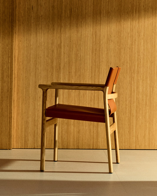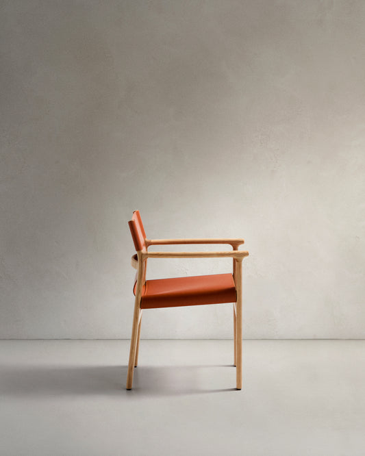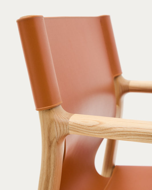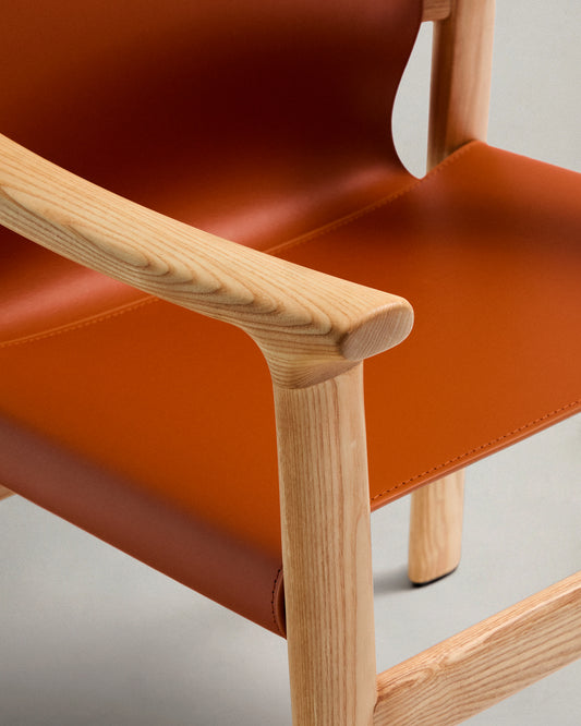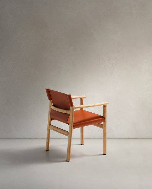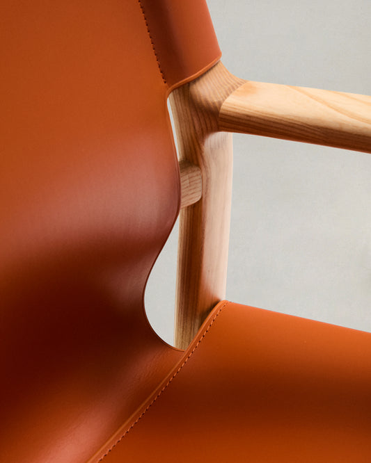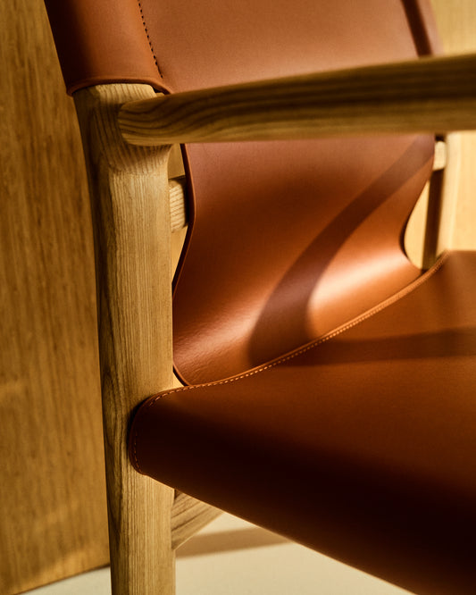 Cadira Jan de fibres de cuir reciclat marró clar i fusta massissa de freixe amb acabat en to natural FSC 100%