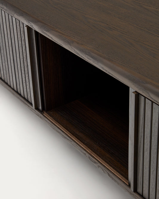 - Moble de TV fet de xapa de freixe amb acabat fosc.