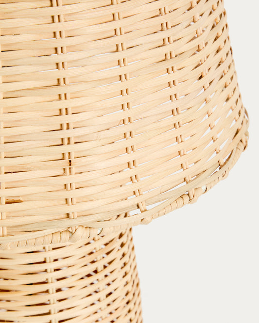 • Llum de taula fet de rotang amb acabat clar.