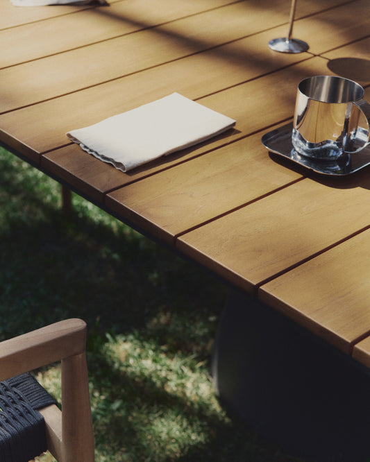 Taula d’exterior Tudons d’alumini amb acabat gris i teca FSC 100%, 148 x 148 cm